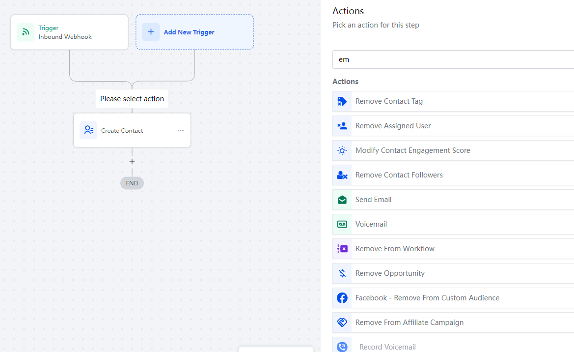 On the new workflow window, click “Add New Trigger”, find “Inbound Webhook” event from Events list