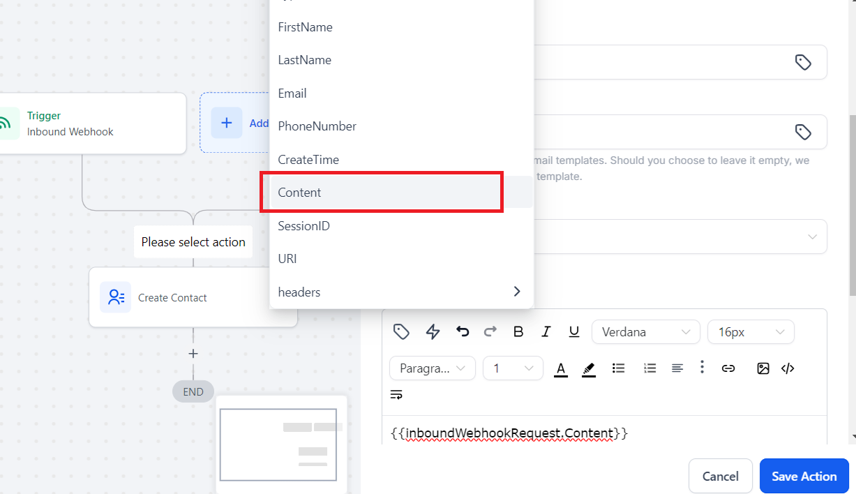 Click "Add field" button, choose Fields "Email", and click the little icon, in the popupwindow, choose {{inboundWebhookRequest.Email}}