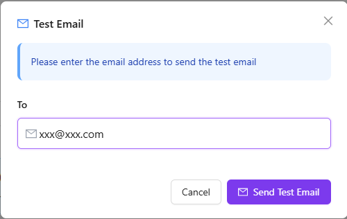 Enter the recipient email address in the pop-up dialog, click the Send Test Email button, then check the target email inbox. Note: The recipient email cannot be the same as the sender email.